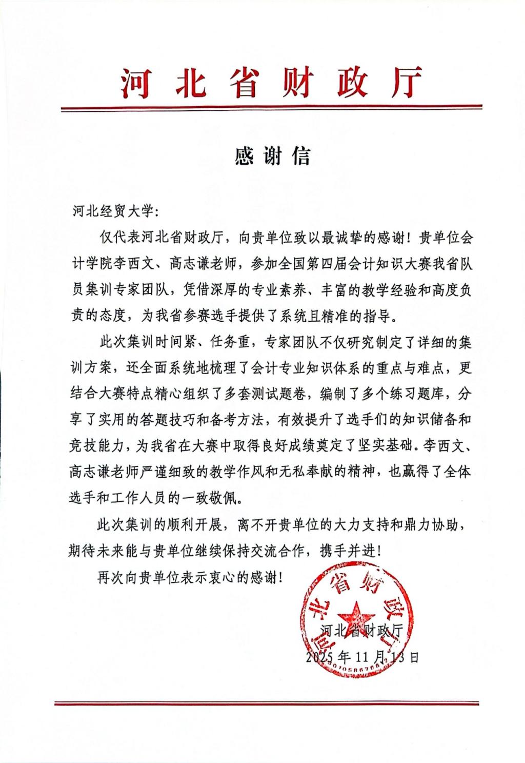 河北省财政厅发来感谢信