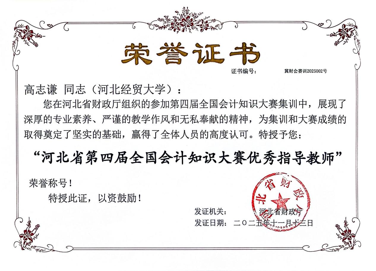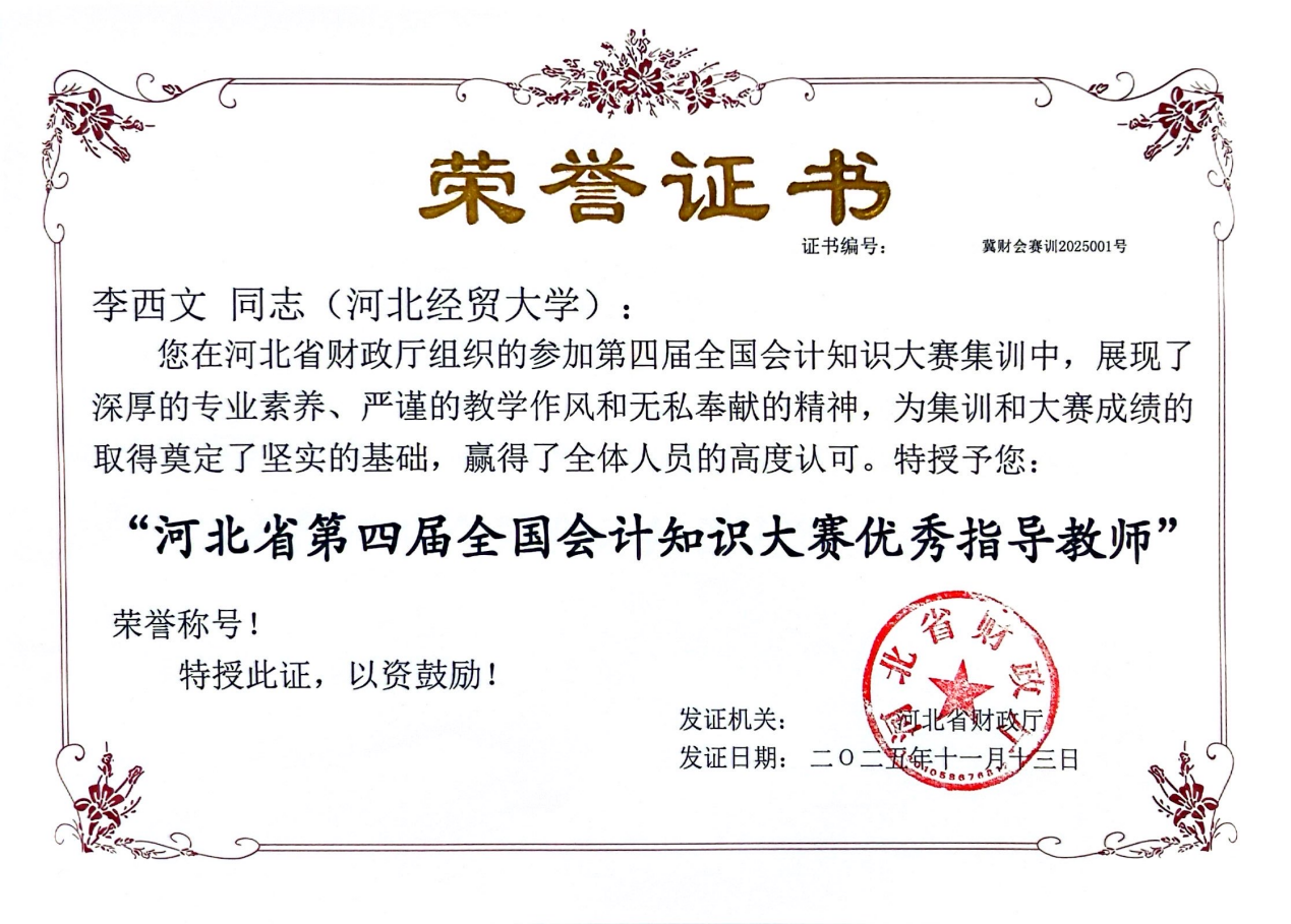 在全国总决赛备战阶段,永利3044noc李西文、高志谦两位教师受邀参加河北省队队员选拔和培训全过程。面对集训时间紧、任务重的挑战,两位教师充分发挥专业优势,系统制定详细集训方案,全面梳理会计专业知识体系的重点与难点,结合赛事特点精心编撰多套测试题卷与练习题库,毫无保留地分享实用答题技巧与备考方法,有效提升了我省参赛选手的知识储备与竞技能力,为河北省代表队在全国总决赛中斩获优胜奖筑牢坚实基础。其严谨细致的教学作风与无私奉献的精神,赢得了省财政厅主管领导的高度认可和一致好评。因突出贡献,李西文、高志谦被河北省财政厅授予“河北省第四届全国会计知识大赛优秀指导教师”荣誉称号。
